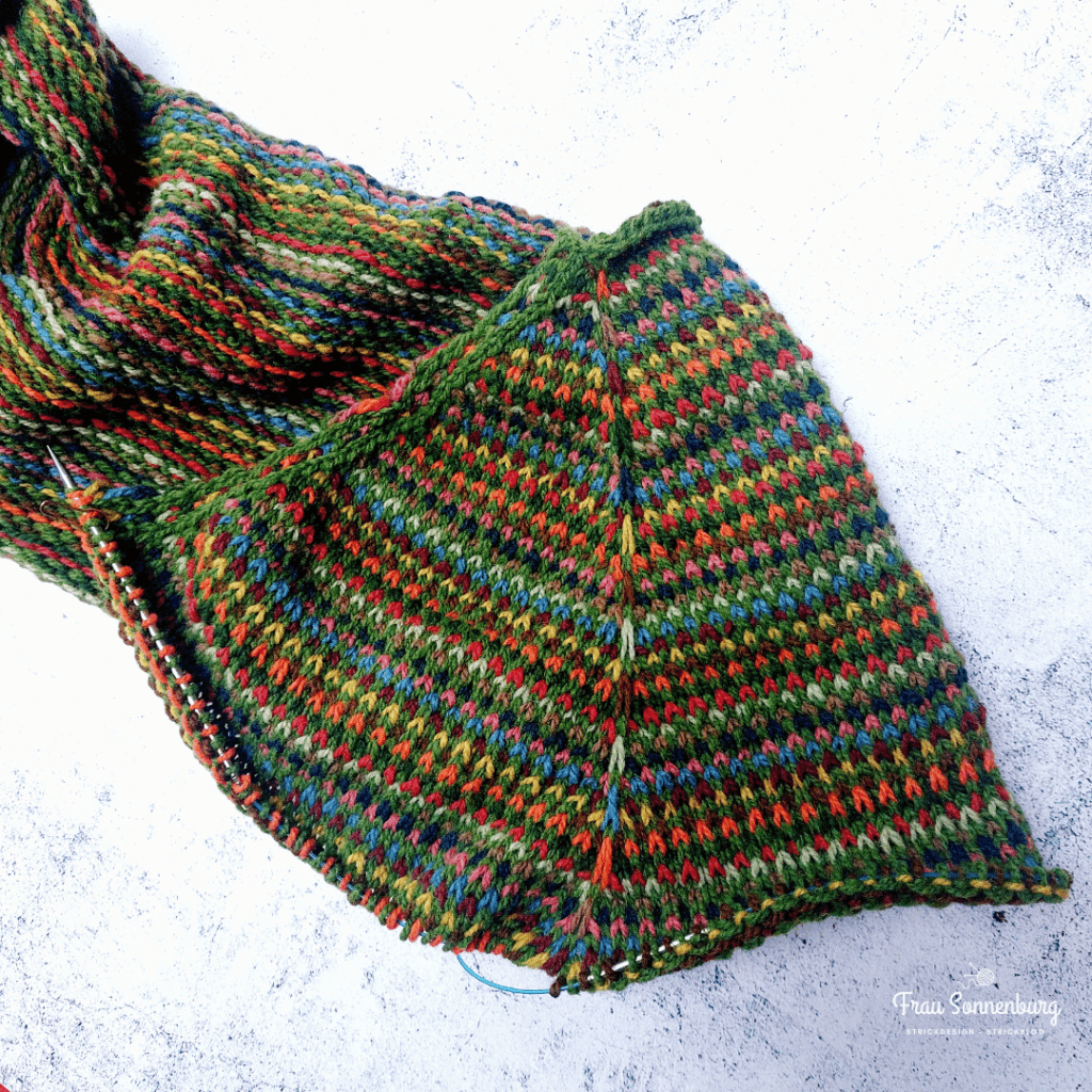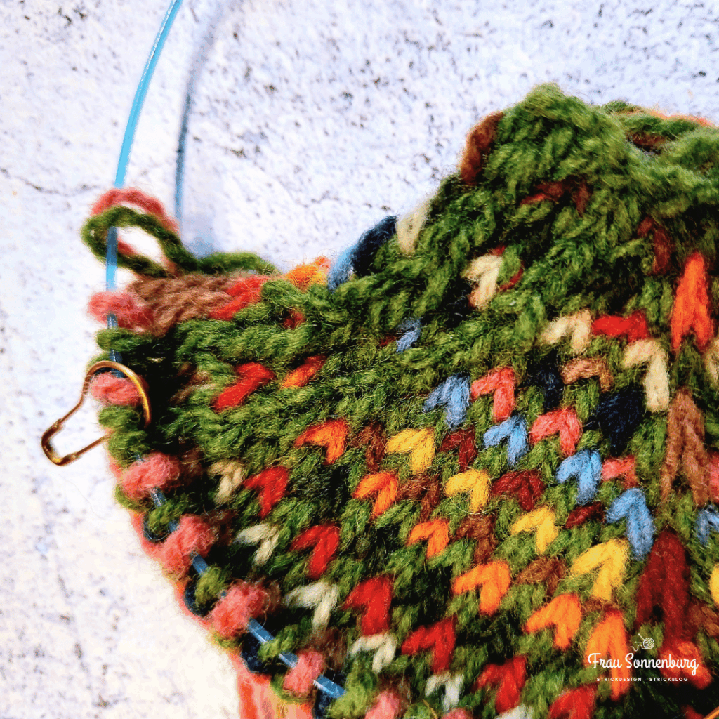 Allmählich wurde mir die Hauptfarbe Grünfink knapp, und so habe ich erst einmal die Maschen des Körpers stillgelegt und das Bündchen auf später vertagt. Es begann das