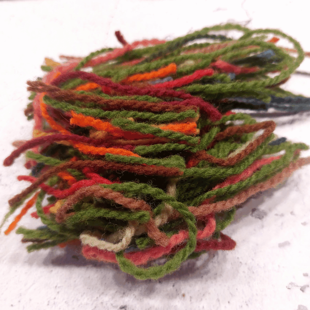 Das ist eine Menge Arbeit und kostet richtig viel Zeit. Meine Strategie war demnach, am Ende jeder Stricksession alle Fäden des gestrickten Abschnitts zu verknoten. So waren zum einen die losen Enden gesichert, und eine riesige unschöne Arbeit in kleine Abschnitte „filetiert“ und erledigt. Viele kleine Fadenabschnitte fallen dabei an: