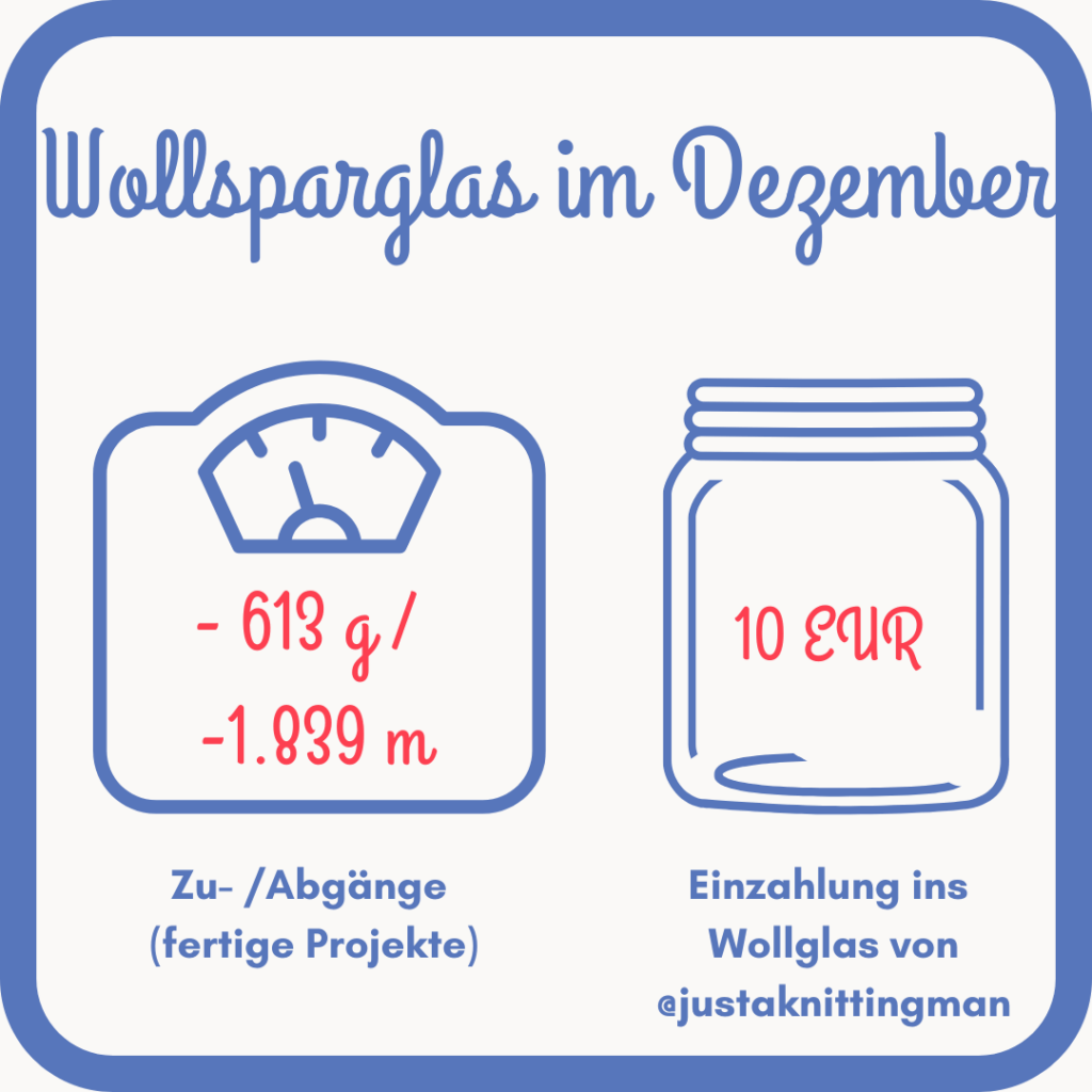 Insgesamt kommen diesmal weitere 10 EUR zusammen. Zusammen mit den 128 EUR aus dem November sind damit zum Jahresende 138 EUR im Wollsparglas von Just a knitting man.