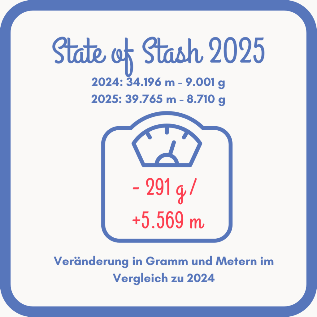 Aktuell befinden sich in meinem Vorrat 39.765 m Garn mit einem Gesamtgewicht von 8.710 g. Das sind fast 5.500 m MEHR als 2024 (34.196 m). Die Wolldiät war also kein Erfolg in diesem Jahr. Insbesondere der Besuch bei der Hamburger Wollfabrik hat voll reingehauen.