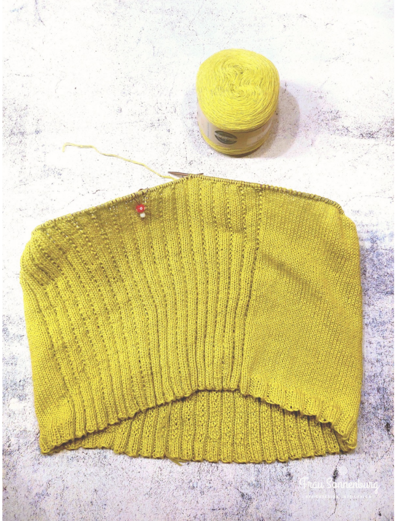 Ich stricke den Pullover auf den neuen Mystic Lace von addi. Die hauen mich bei diesem Garn wirklich von den Socken. Durch den Poly-Anteil von 50% ist das Garn eins von der rutschigen Sorte, und wird von der Oberfläche der Nadeln super abgebremst. Ach, und diese spitze Lace-Spitze – die ist einfach phänomenal!