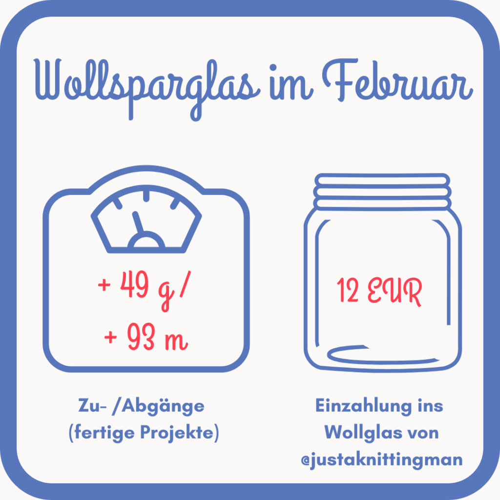 Das macht insgesamt 12 EUR. Zusammen mit den 9 EUR aus dem Januar sind nun schon 21 EUR im Wollsparglas von Just a knitting man.