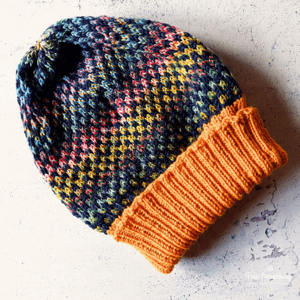 Gedacht, gemacht – naja, jedenfalls fast. Die Mütze war mein handliches Mitnahmeprojekt für eine kürzliche Reise mit der Bahn. Das Bündchen in dem herrlichen Sonnengelb strickte sich noch ganz flink, aber das Hebemaschenmuster mit dem Schöppel-Farbverlaufsgarn wollte mir in der Runde nicht gelingen. Da ich nun aber sehr geübt bin im zweifädigen Stricken, änderte ich den Plan einfach und strickte einen 2/2 Farbwechsel, der sich alle 2 Runden versetzt. Quasi ein „Würfelmuster“.