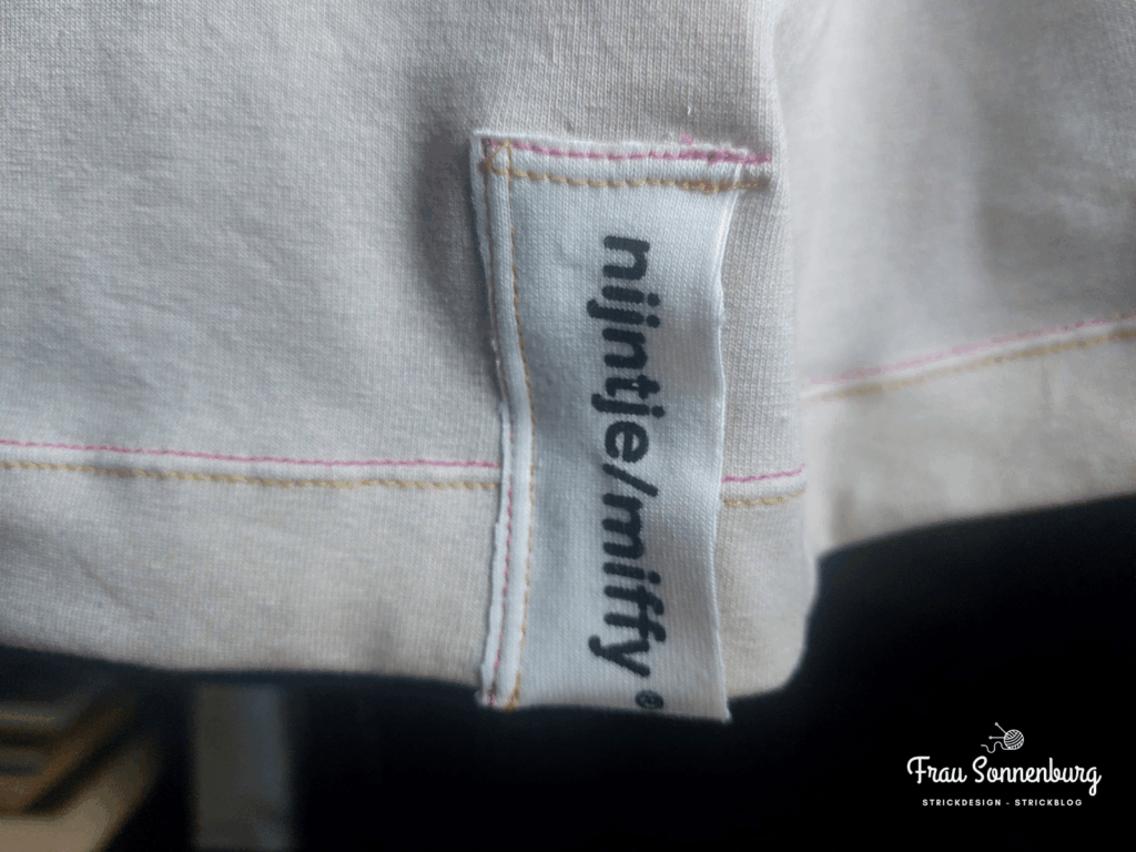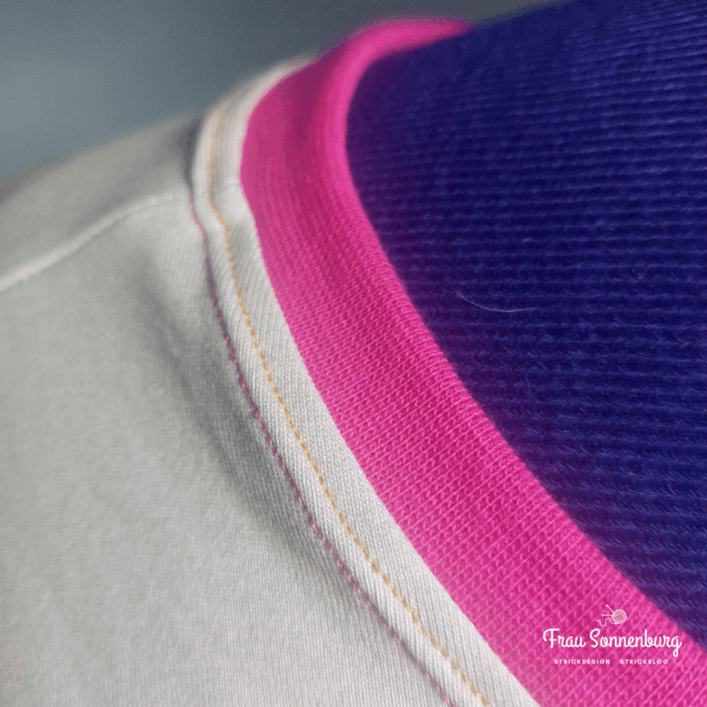 Für ein bisschen mehr Farbe habe ich die Zwillingsnähte am Saum und am Halsausschnitt zweifarbig genäht (gelb und pink) – so was mag ich immer gern. Und zum guten Schluss habe ich aus der Webkante noch ein Label gebastelt und ebenfalls zweifarbig am Saum angenäht.