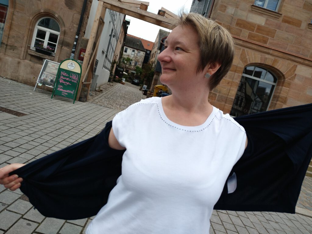 Das Shirt gibt es immer noch, und es wird im Sommer gern getragen. Ich habe mir das gleiche Shirt in 2024 (ohne die „Ameisenkante“) noch einmal genäht, sozusagen als Backup. Daher hatte ich den Schnitt noch als unproblematisch auf dem Schirm, als sich die Frage nach dem Schlafshirt stellte.